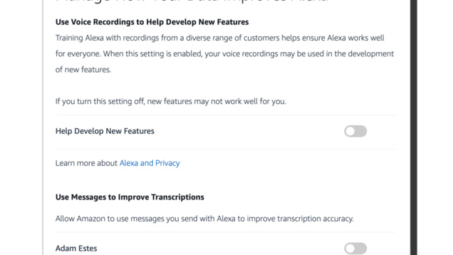 So I find myself circling back to a few questions. Who’s looking after the users? Why can’t I opt in to letting Amazon record my commands instead of wading through privacy settings looking for ways to stop sending my data to Amazon? And why are my options for opting out limited?